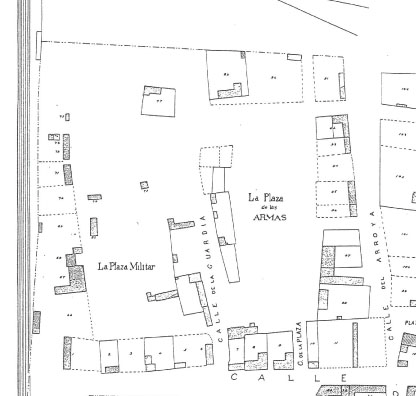 The 1862 Fergusson map of downtown Tucson depicts the area of the Presidio fortress. The San Agustín Festival took place in the Plaza de las Armas while the Presidio was still active. The recently excavated area, discussed below, is located along the dashed line on the north side of the plaza.