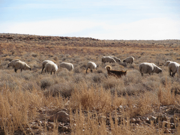 A herd of sheep guarded by a dog, photograph taken in northern Arizona.