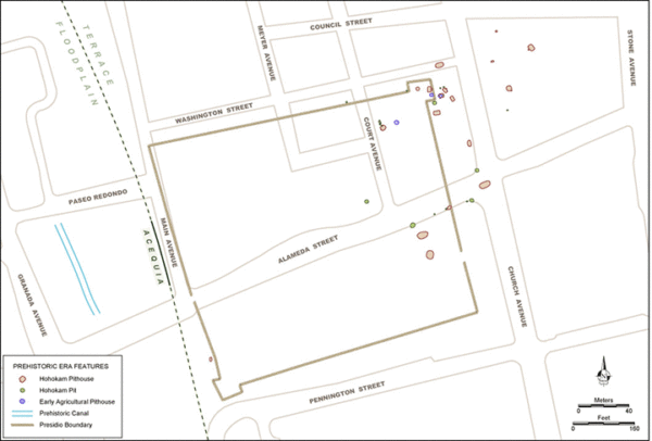 In all, 80 pre-contact (a blanket term for the thousands of years preceding the arrival of Europeans in the Southwest) features have been documented downtown. Most have been encountered due to cultural resource legislation that requires archaeological fieldwork prior to construction or the monitoring of ground disturbance within the boundaries of a known site.