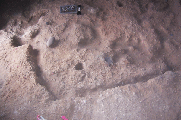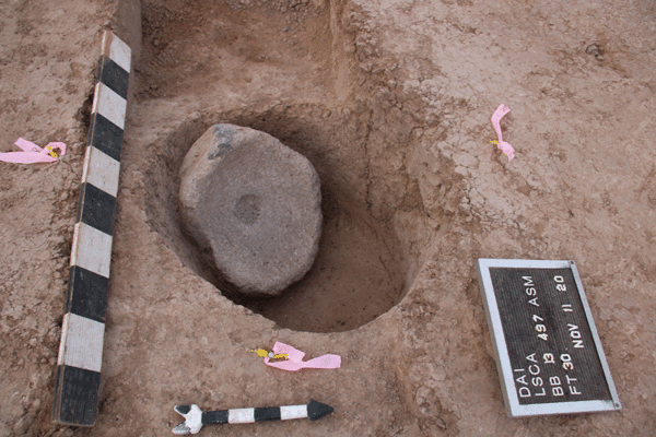 A pit containing a large basin metate that was re-used as a mortar. The pit was radiocarbon dated to the San Pedro phase.