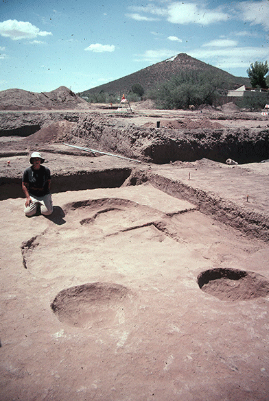 The Hohokam features encountered downtown range in date from the Tortolita phase of the Hohokam Pioneer period (AD 500-700) to the Middle Rincon phase of the Sedentary period (AD 1000-1100). The features include pit structures, pits, soil mining areas, and inhumation funerary features. During this time, many Hohokam communities built oval ball courts that were used for playing a special ball game and other ceremonies, bringing people from different communities together to trade and probably to find spouses. It is likely that a ball court once existed downtown, and perhaps someday one will be encountered.