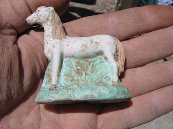 This painted horse figurine was recovered from a privy pit on Historic Block 83 (photo by Homer Thiel).