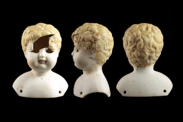 A blond boy doll head, which once had inset glass eyes and was sewn to a cloth or leather body, found on Historic Block 95 in Tucson (photo by Rob Ciaccio).