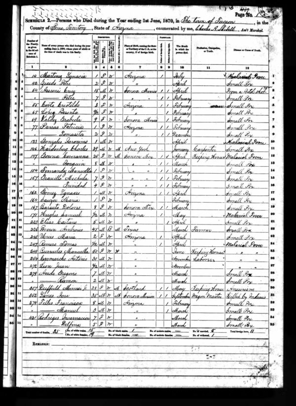 A page from the 1870 United States Mortality Census listing deaths in Tucson. The age at death column is to the right of each person’s name, and the cause of death is on the right side of the page.