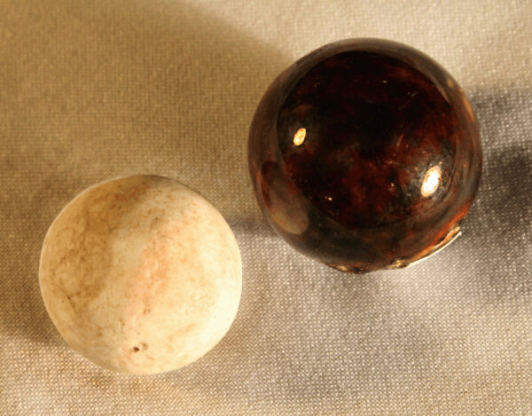 An unglazed and a glazed fired clay marble from Historic Block 181 in Tucson (photo by Rob Ciaccio).