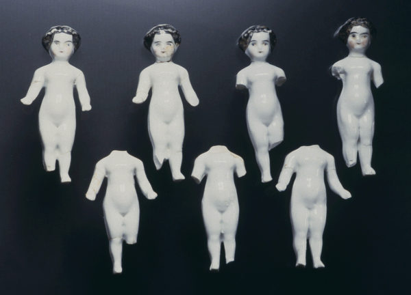 Seven inexpensive, identical Frozen Charlotte dolls, found discarded on Historic Block 139 in Tucson (photo by Rob Ciaccio).