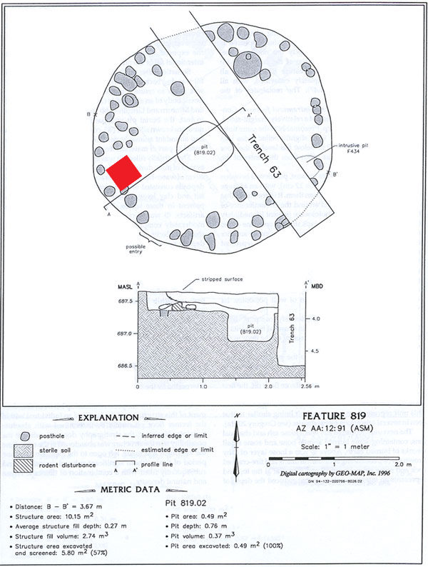 Map of pithouse Feature 819 at Los Pozos. The red square shows the location of the Feature 819.17 floor array.