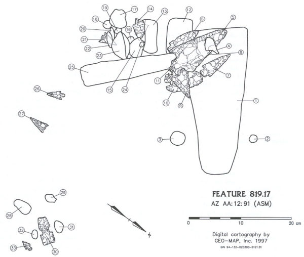 Among all of the excavated houses, the most unusual set of artifacts found to date was lying on the floor of Feature 819 at Los Pozos. This site is located in Tucson on the east side of the Santa Cruz River, north of modern-day Prince Road. A crescent of houses was uncovered by Desert Archaeology in 1995, with the eastern portion lying beneath the eastbound lane of I-10.