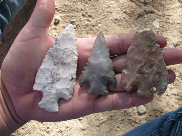 Homer Thiel demonstrates the size of three of the points from the array.