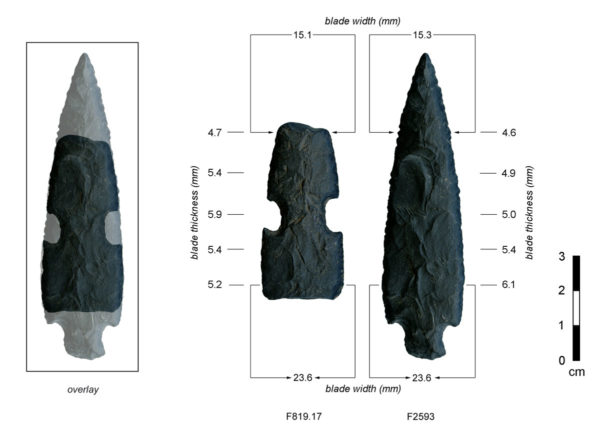 Comparison of the reworked point blade from the Feature 819.17 array at Los Pozos and a nearly identical point from Feature 2593 at the site, excavated 17 years later.