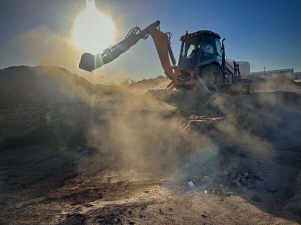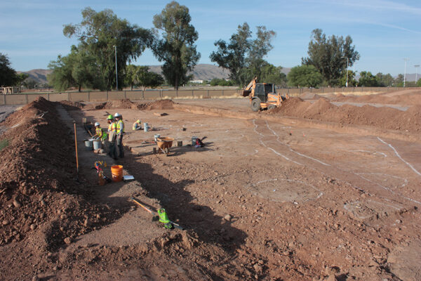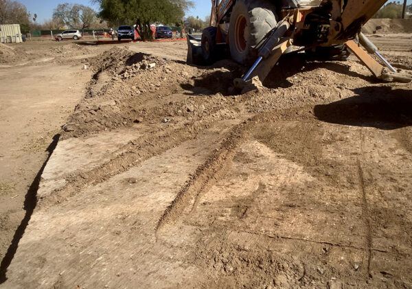 Backhoes don’t just crudely move masses of dirt, however. The ability of a backhoe operator to skim off 1 or 2 cm of dirt to provide a clean look at subsurface deposits is invaluable. In the hands of a skilled operator, the backhoe functions as a giant trowel for archaeologists. When we’re monitoring a backhoe, we’re looking for soil color differences and sometimes subtle texture changes. These clues indicate the presence of subsurface features, which we can identify and mark for further investigation.