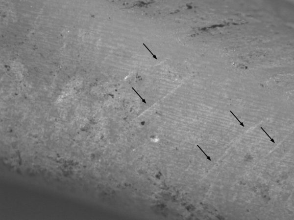 Photomicrograph at 40x magnification of a shell bracelet from the pre-Classic Hohokam site of La Villa in Phoenix (click to enlarge). The scattered diagonal abrasions (arrows) are from manufacturing. The multiple horizontal lines are the laminations that give the shell a feathery appearance. Photomicrograph by Jenny Adams.