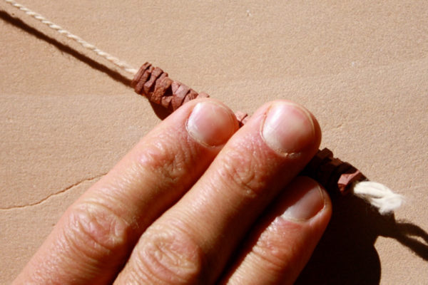 Multiple beads strung together for final shaping against a flat, fine-grained netherstone. Photograph from Zack Curcija's master’s thesis at Northern Arizona University, used with permission.
