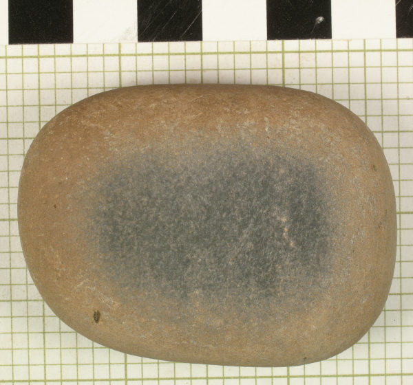 Lapstone found at La Villa that is fine-grained enough to have been used in the finishing stage of stone or shell ornament. The darker area on the surface is smooth and would have put a light polish on the ornament. Photo by Jenny Adams.