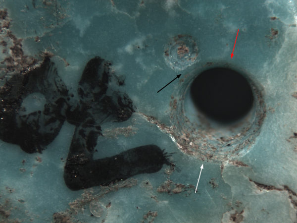 Photomicrograph at 40x magnification of a biconical hole in a turquoise ornament drilled with a stone bit (click to enlarge). The curvilinear abrasions inside the hole and the narrowing of the hole toward the middle are the telltale signs of a stone bit. Toward the top, the abrasions and the sharp edge of the hole have been worn smooth from rubbing against a string (red arrow). Compare this area to the bottom of the hole, where striations from the drill are still visible (white arrow). Note also the small depression to the upper left that marks an earlier attempt at drilling a hole. Use-wear from the string has obscured the lower right edge of the unfinished hole (black arrow). The bead was recovered from a Hohokam Sedentary period (AD 950-1150) pithouse at Honey Bee Village in Oro Valley. Photomicrograph by Jenny Adams.