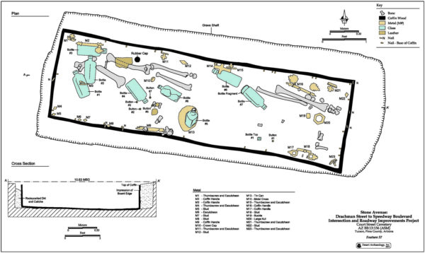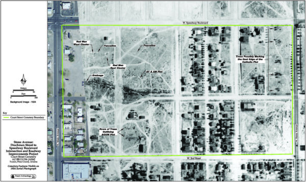 In 2012, Desert Archaeology was contracted by the City of Tucson to examine a parcel of land located at the southwest corner of N. Stone Avenue and W. Speedway Boulevard. At the time of the work, the parcel was a dirt lot. A decade earlier the corner was the location of a 1st National Bank of Arizona building, torn down in the early 2000s. Historically, the lot was within the boundaries of the Catholic portion of the historic Court Street Cemetery, in use from 1875 to 1909. Were there graves to be found?