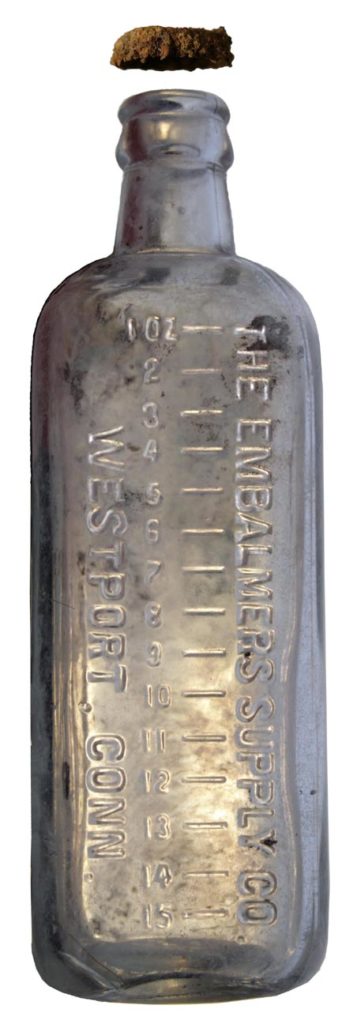Scattered about in the interior of the coffin were 11 embalming fluid bottles, discarded by workers from a funeral home hired to exhume the burials. Each was embossed THE EMBALMERS SUPPLY CO. WESTPORT, CONN., along with graduated markings that allowed the embalmers to determine how much fluid to use.