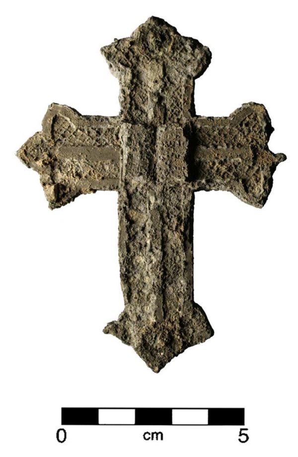 Lead cross from the Feature 37 coffin (photo by Robert Ciaccio).