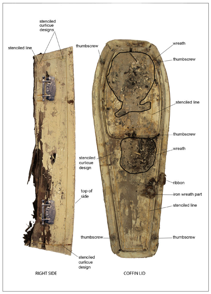 Plant remains and ribbon on the lid of this walnut wood coffin came from a rose wreath. The coffin handles had the saying "Our Darling" on them (photograph by Robert Ciaccio).