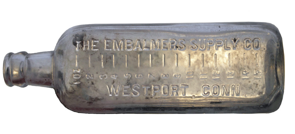 Bottle embossed THE EMBALMER'S SUPPLY CO. WESTPORT, CONN., found in burial Feature 37 by Desert Archaeology crew (photograph by Robert Ciaccio).