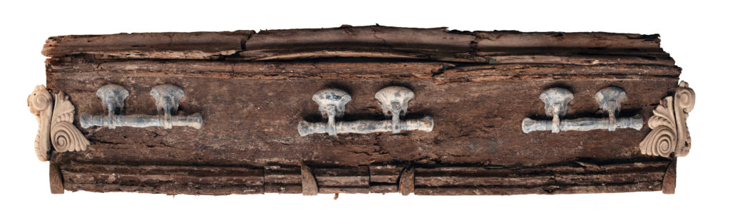 This well-preserved coffin has molded gutta percha griffins on each corner, wooden molding, and swing bail handles (photograph by Robert Ciaccio).