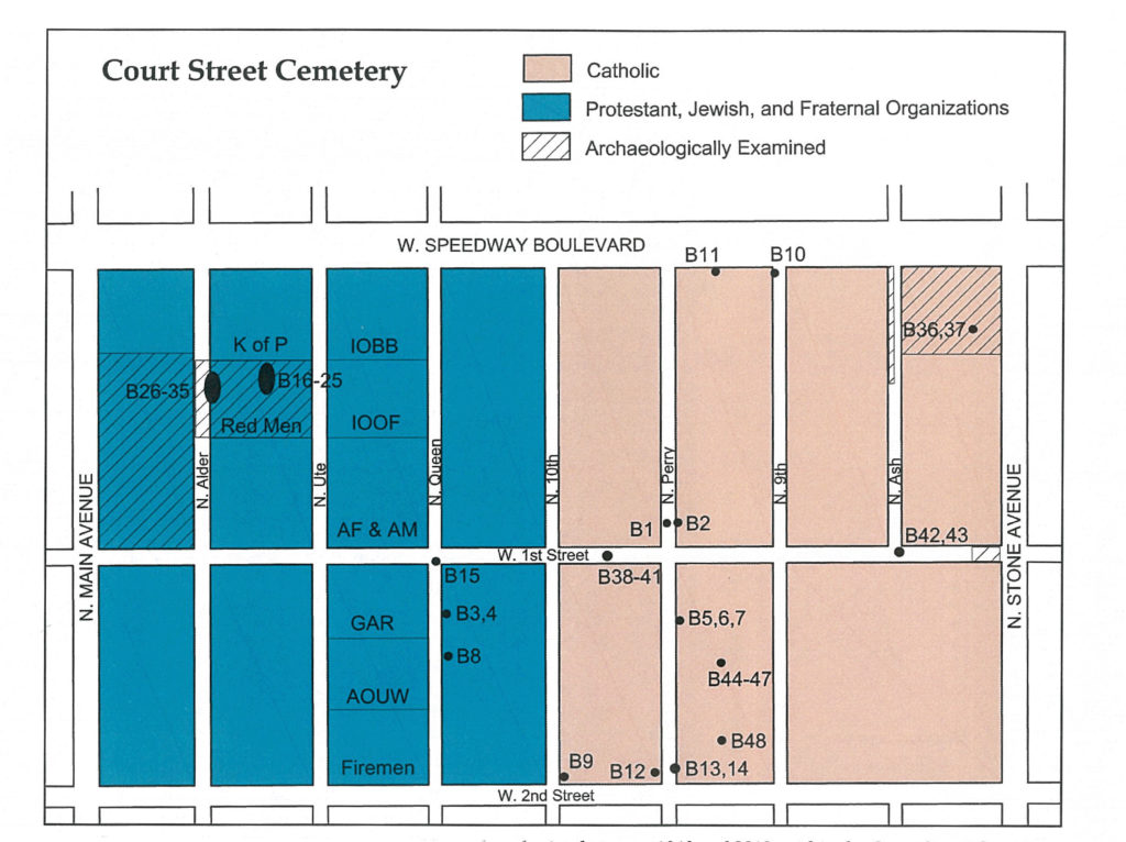 Hidden beneath the streets, sidewalks, homes, and businesses of an eight-block area located across the street from downtown campus of the Pima Community College in Tucson is the historic Court Street Cemetery. It opened in 1875, after Tucson's Common Council decided the existing downtown cemetery, now the location of the Pima County Joint Courts Complex, was a nuisance and the land too valuable. Statistical Research, Inc., excavated this cemetery between 2006 and 2008, finding the remains of 1,386 individuals in 1,083 graves and disturbed areas.