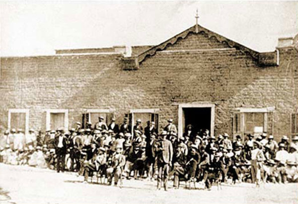 Arizona became a state on February 14, 1863, when President Lincoln separated it from New Mexico Territory. Pima County was one of five original counties, with Tucson as the county seat. Initially, governmental business was conducted in rented spaces. By 1868 a decision was made to build a courthouse. The county purchased Robert Leatherwood’s stables, tore them down, and built an adobe brick structure fronting Court Street, to the west. Decorative wood trim was added a few years later on the front façade. The courthouse is best known for the 1871 Camp Grant Massacre trial, when about 150 men were put on trial for the massacre of over 100 Apache, mostly women and children. A photograph of the defendants lined up in front of the courthouse survives. The men were acquitted by the jury.