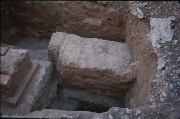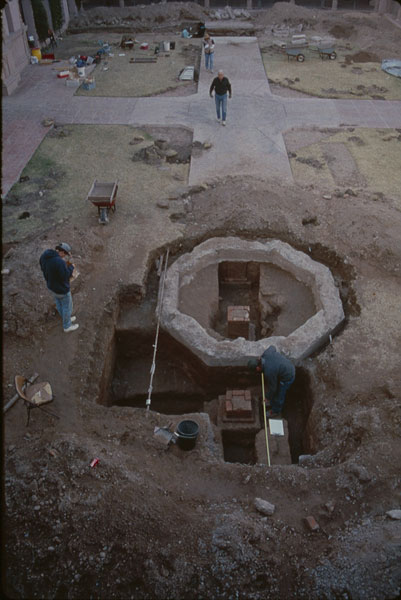 The 1929 Courthouse fountain, located during a dig conducted in 1992. The section of the Presidio wall shown above is visible here with a clipboard on it, next to the man with the measuring tape, in the lower right portion of the excavation pit (photo by Homer Thiel).