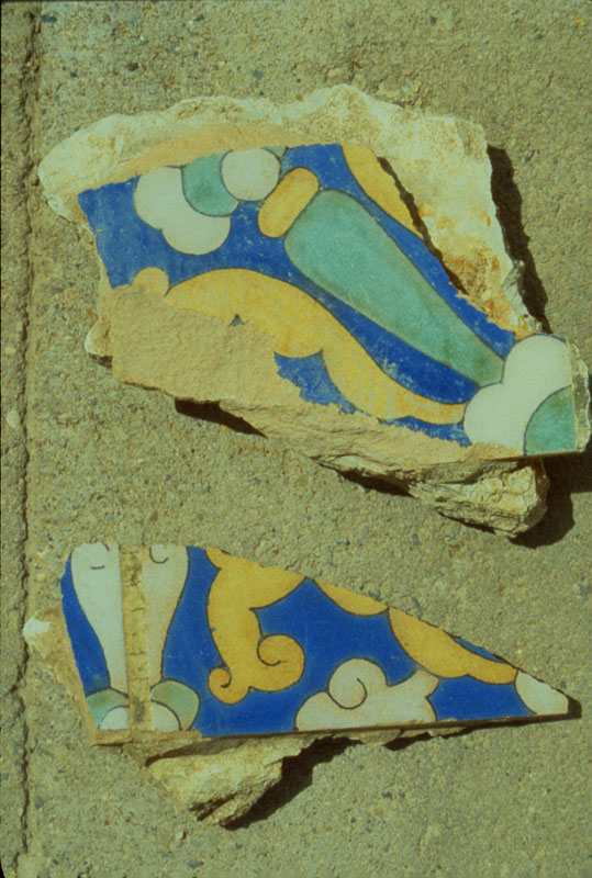 In addition, we found the foundations of a hexagonal fountain that was built for the 1929 courthouse, but was dismantled after the foundations settled onto one of the 1881 jail floor joist piers, cracking the fountain. It was the Depression era, and there was no money to repair it, so it was torn down. Scattered around it were fragments of the decorative tile that had adorned it. After the excavation, the fountain was recreated, but using tile patterns depicted on the original plans—designs that did not match the pieces found. A photograph later revealed that the archaeological tiles had in fact once adorned the fountain.