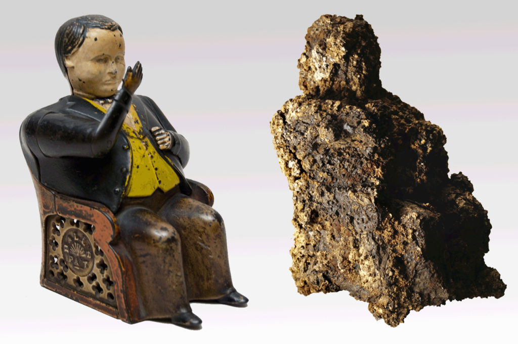 An auction catalog photo of a Tammany mechanical bank and an identical bank from the Burkhalter family privy (archaeological example photographed by Robert Ciaccio).