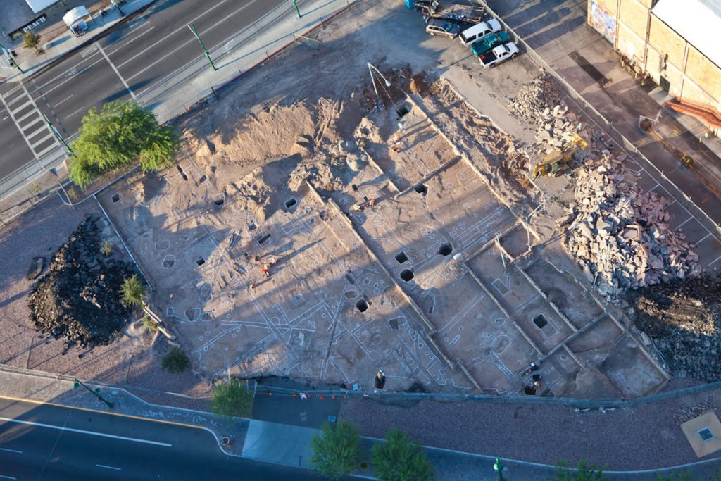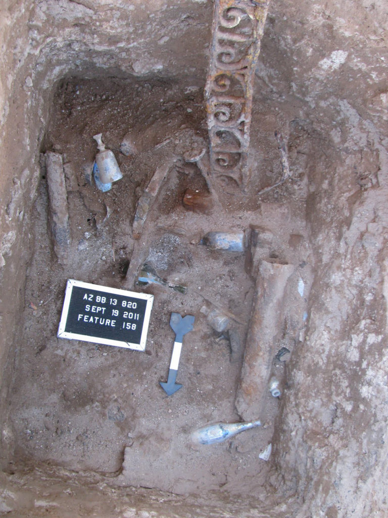 The City of Tucson acquired the land in a complex deal and Desert Archaeology conducted excavations there in 2011. A backhoe equipped with a wide scraping blade pulled up asphalt pavement and the concrete floors of the bus terminal, and then stripped away debris down to the underlying hard caliche layer, exposing 100 features. These included building foundations, a well, animal burials, and eight privy pits.