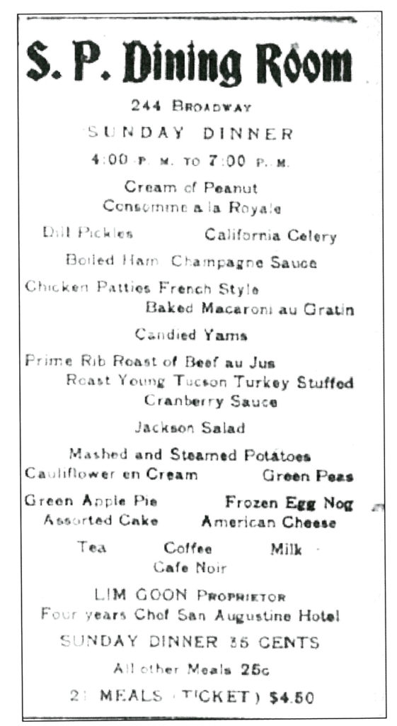 An advertisement for the S. P. Dining Room (Tucson Citizen, 14 January 1905).