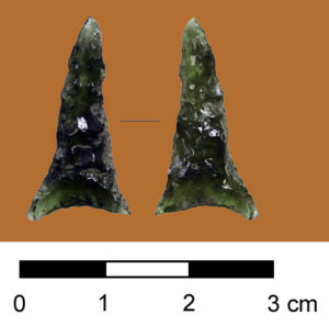 A Sobaipuri arrow point made from olive green bottle glass found in the chute and pen complex.
