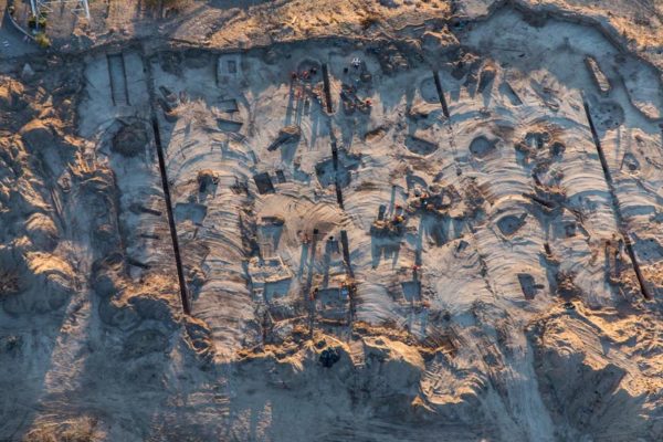 An aerial photograph of the Paseo Site, showing archaeologists excavating several pit structures dating to the late portion of the Early Ceramic period (photo by Henry Wallace).