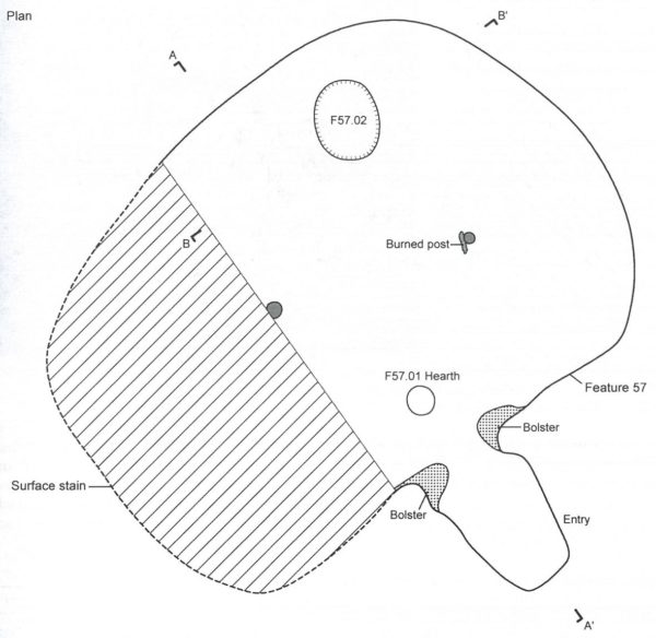 Feature 57 was one of the earliest pit structures at the Paseo Site. It had adobe bolsters at the juncture between the house floor and the entranceway.