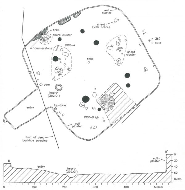 Feature 392 at the Stone Pipe Site dates to late in the Early Ceramic Period. It had partially plastered walls, indicating it was a true pit structure, and eight postholes showing the locations of interior posts that helped to support its roof.