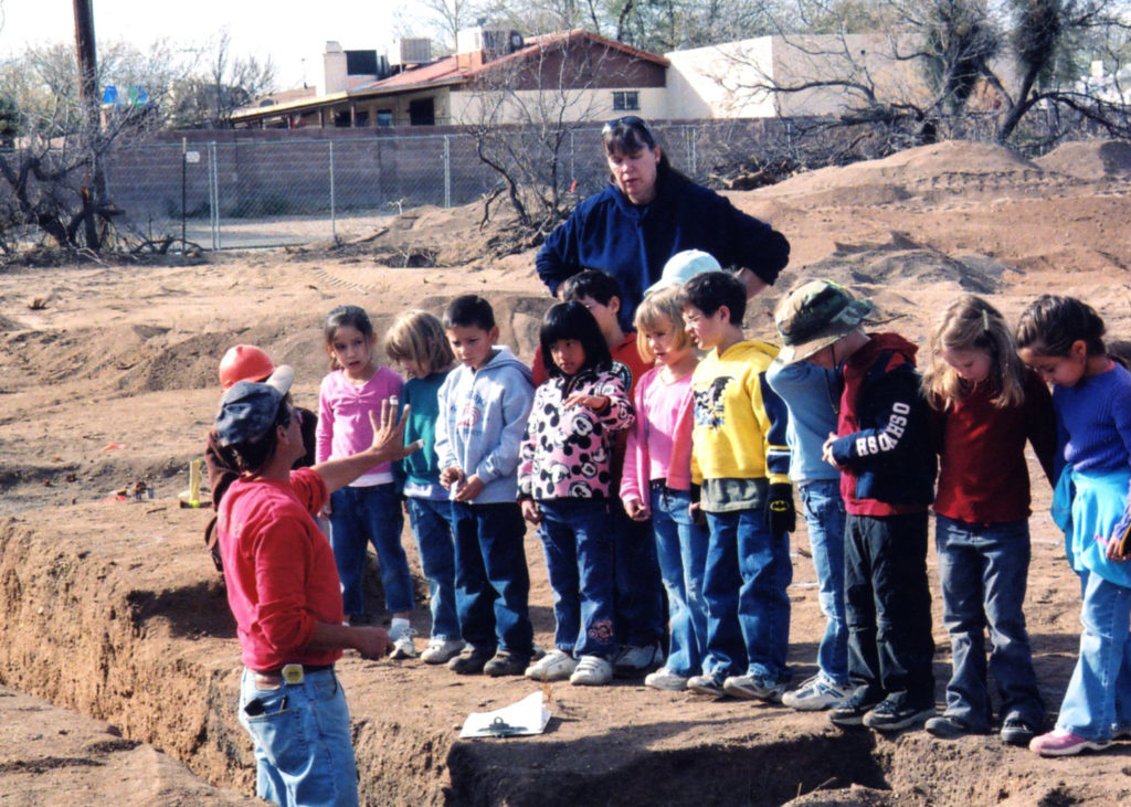 Mark (in red) conducts a tour for daughter Rachel's (in Mickey Mouse jacket) kindergarten class on his return to the Tanque Verde Wash site.