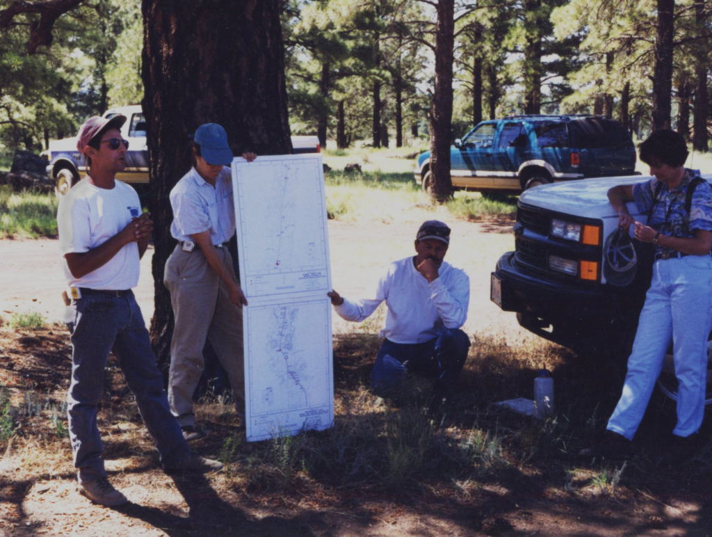 Front to back: Peter Pilles, Terry Samples, Debbie Swartz, Mark Elson, Linda Farnsworth, Bill Doelle, and Bob Gasser exploring the US 89 project area before the start of fieldwork, 1997.
