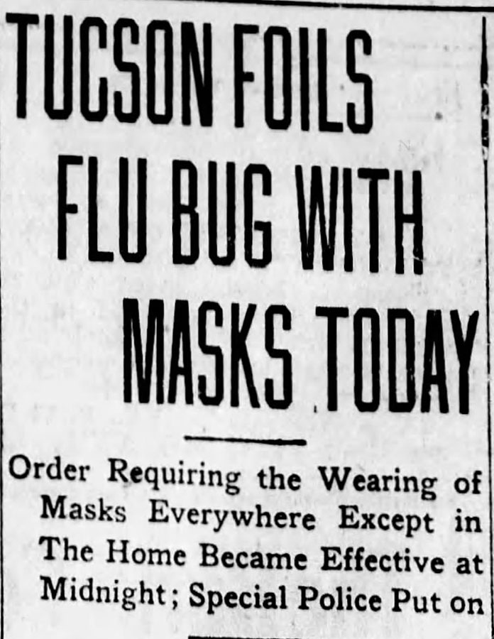 In 1918, a new pandemic spread throughout the world. It was called the Spanish Influenza because the Spanish government was the first to publicize it. Soldiers returning from Europe during World War I helped spread the disease. People in Tucson could read about this in local newspapers, but likely did not expect it to affect the community. They were wrong. The first deaths took place in September. In Tucson, quarantines were quickly established, public gatherings banned, and schools and churches closed. The Arizona Daily Star provided helpful instructions, such as not sharing toothbrushes and keeping away from crowded places. At the same time, the newspaper printed stories downplaying the severity of the disease in the community. Despite this, late in November, everyone in Tucson was required to wear masks in public, with the police charging those who violated the order.