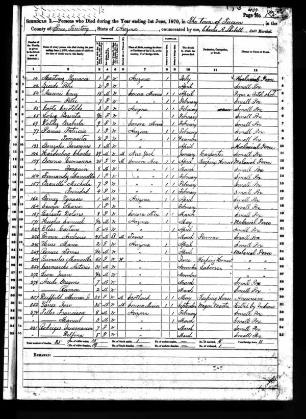 The federal government collected information on deaths in households in the year preceding the decennial census between 1860 and 1880. The forms for Arizona survive for 1870 and 1880. The 1870 mortality schedule lists 139 deaths in Tucson. These included people “killed by Indians,” delirium tremens, and “suicide pistol shot in head.” But most people died from communicable diseases.