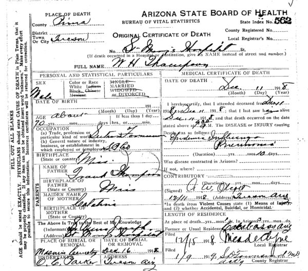 W. H. Thompson died at St. Mary's Hospital from epidemic influenza pneumonia on December 11, 1918.