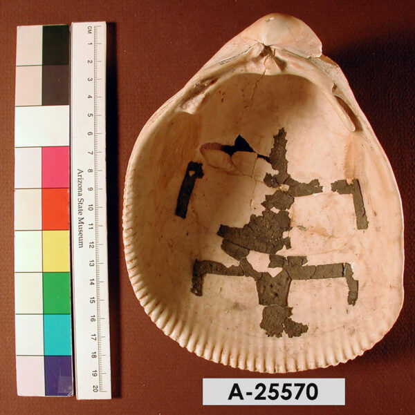 Other specimens with pitch on them have been recovered elsewhere. A unique example is a complete Laevicardium shell that is both etched and painted, from a site near Rillito, Arizona north of Tucson. A similar geometric design is common on Hohokam ceramics made during the Sacaton phase (CE 950-1150).