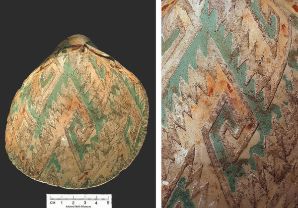 Laevicardium shell with an etched and painted Sacaton phase geometric design (left); closeup view (right). (photo by Arthur Vokes)
