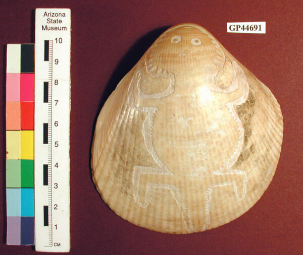 Only one example has been recovered from a mortuary feature, a cremation at the Gatlin Site in the Gila Bend area near the Arizona-California border, while the majority of the etched shells seem to be associated with domestic features such as house floors, house fill, and trash deposits. The limited spatial and temporal distribution of this unique ornament form leads one to speculate that the technique of etching shells was perhaps limited to a few specialists and kept secret through ceremonial restrictions. It is puzzling that more examples are not known from mortuary contexts. However, it has been suggested that the etched shells were not possessions of individuals but instead were possessions of sodalities or some other organizations, which would have prevented them from being interred with an individual.