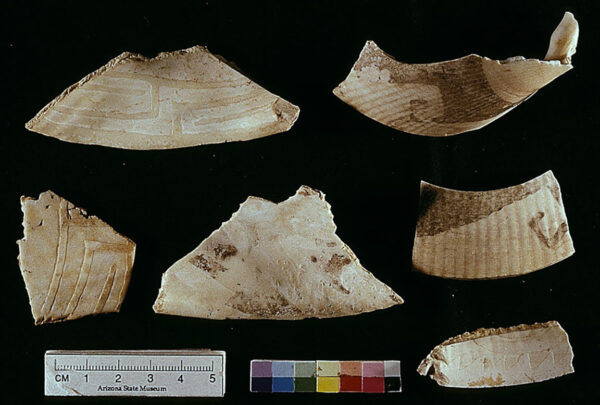 Etched shell fragments from Snaketown. (photo by Arthur Vokes)