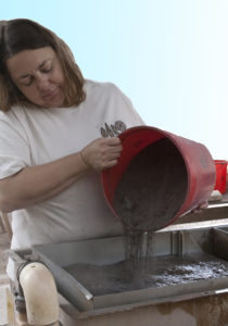 Tanya Yatskievych measures the volume of the dirt from a flotation sample using a graduated bucket, and pours the sample into Desert Archaeology's purpose-built flotation tank.