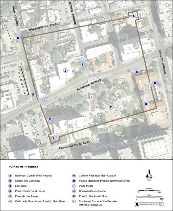 The original Presidio wall alignments and points of interest overlain on an aerial photograph of modern Tucson (image by Catherine Gilman).