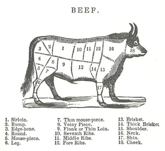 Beef cuts, from the Kentucky Housewife, by Mrs. Lettice Bryan, 1839.