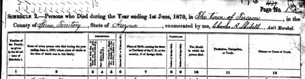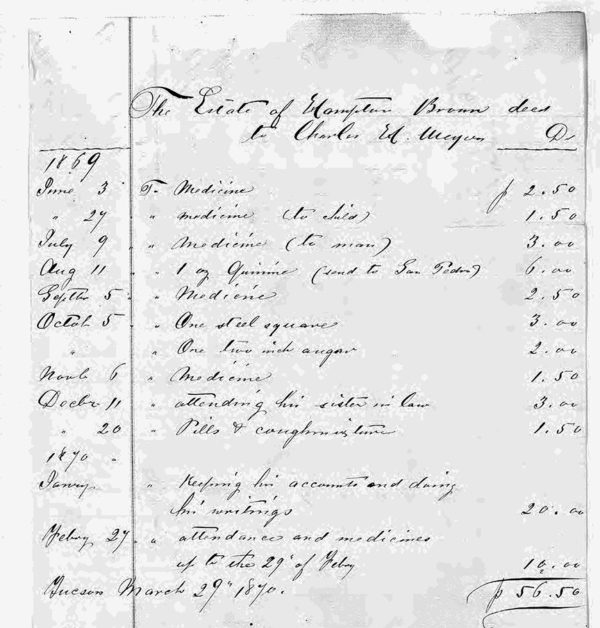In early 1870 a smallpox epidemic struck Tucson. In a matter of weeks dozens of people died, mostly young children. But among the victims was Hampton Brown, who died from the disease on March 11. His probate file contains a bill that reveals the family had purchased claret (a Bordeaux wine made in France) and brandy two days before his death, the alcohol perhaps being administered to Brown as he was dying. The claret would have traveled over 5,600 miles to arrive in Tucson, a testament to the reaches of the global economy in the 19th century.