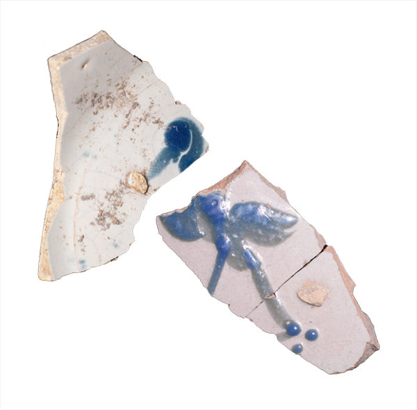 A blue-on-white majolica plate with a bird design (Photograph by Robert Ciaccio, Desert Archaeology).